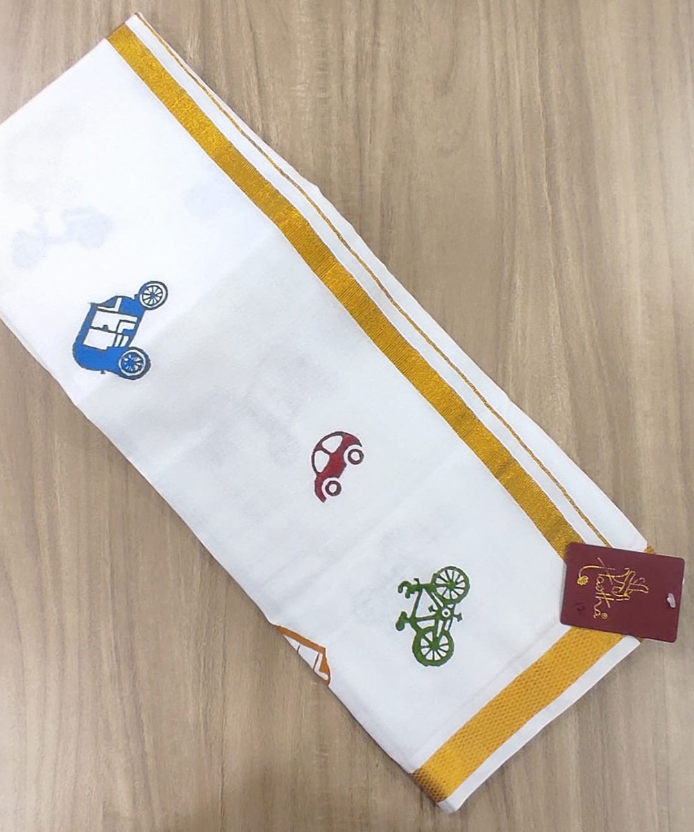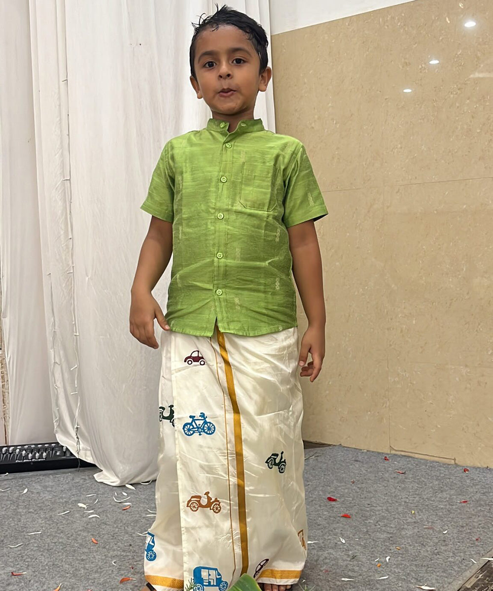 The essence of Madras roads on one little veshti! Scooters and autorickshaws adorn this hand block printed veshti. A unique and stylish addition to your children’s traditional wardrobe. The fabric is hand block printed using traditional methods, giving each veshti a unique, one-of-a-kind pattern and finish. The intricate designs and vivid colors add a touch of modern elegance and cultural heritage to the outfit.