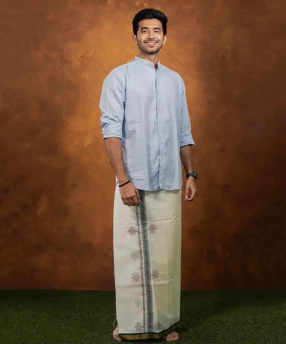 Our Kolam Calling dhoti features dots and dashes that remind you of home. This kolam print will take you back to your roots.