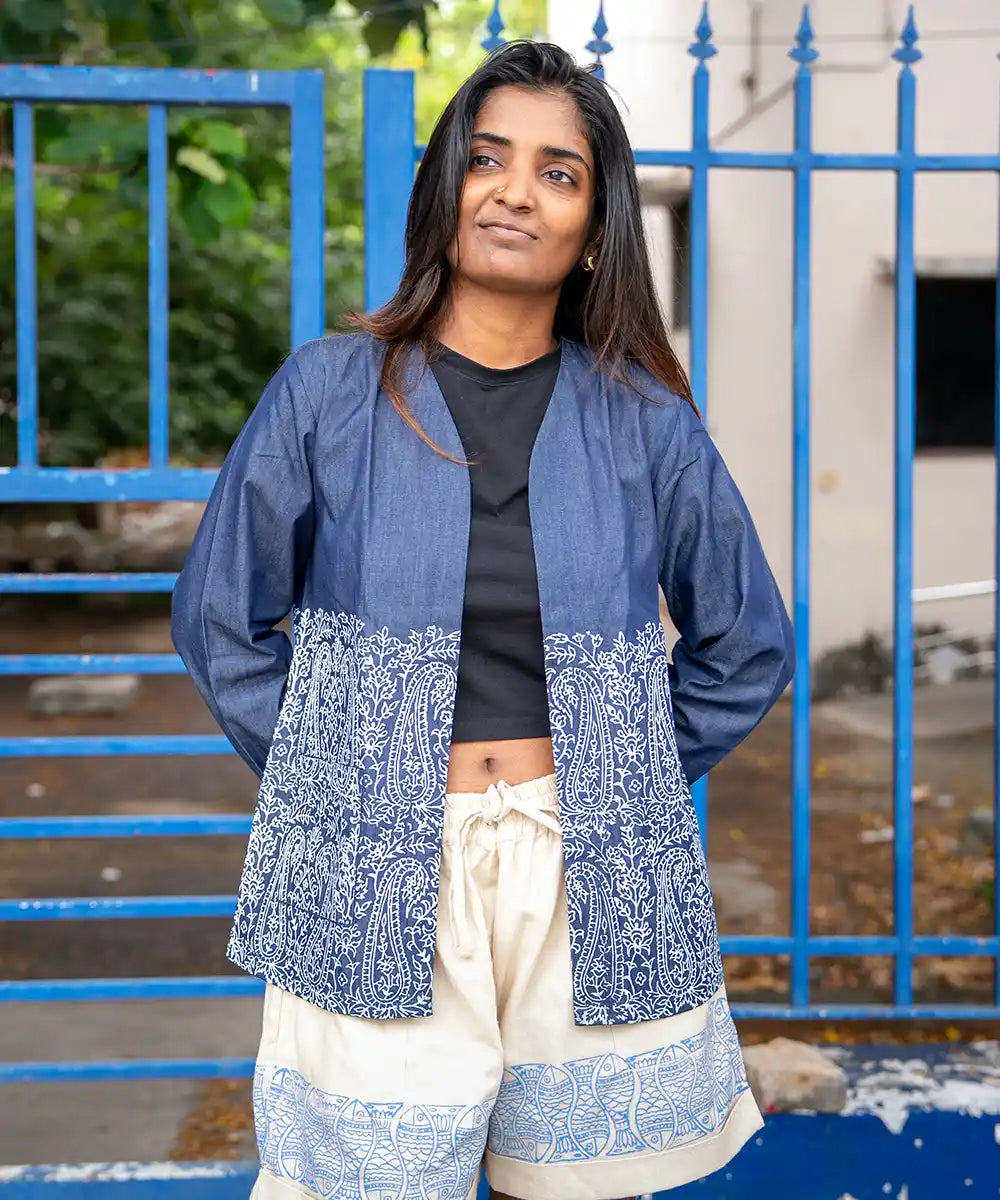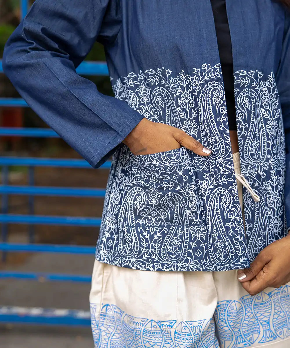 Introducing elegant hand block printed overlay for women! Made with denim, these overlays are versatile. The unique hand block printing technique used on these overlays ensures that each piece is one-of-a-kind, making them a great addition to any woman’s wardrobe.